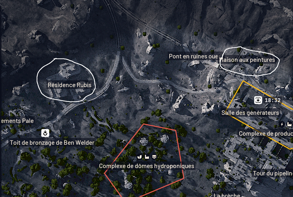 Nous savons déjà où trouver les Abricots, puisqu’ils sont également nécessaires pour la deuxième amélioration de Coquillard.Pour les Champignons, le meilleur emplacement se situe près du Dome Complex, où la végétation dense abrite souvent ces ressources.