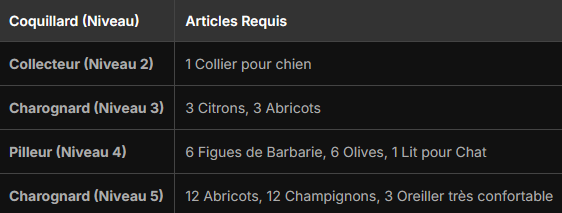 Le dernier niveau d’amélioration de Coquillard nécessite des Abricots, des Champignons et des Oreiller très confortable.